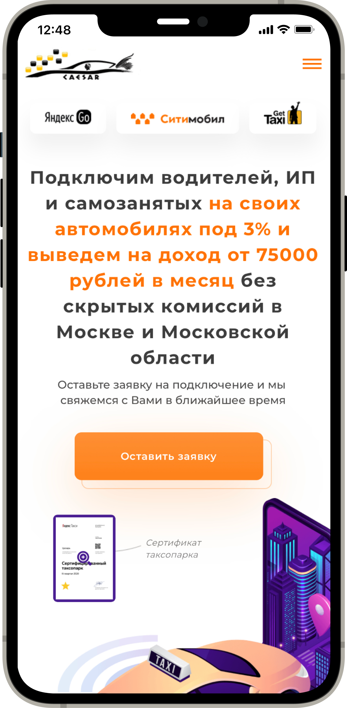 Caesar, одностраничный сайт который помогает пользователям подключится к системам такси. Задача была разработать сайт для компании, которая подключает водителей к популярным платформам Яндекс.Такси, Gett такси, Ситимобил, и другие. Сайт отвечает всем требованиям качества, безопасности и функциональности, а также адаптирован под все современные устройства и разрешения. Дизайн выполнен в фирменном стиле компании.
